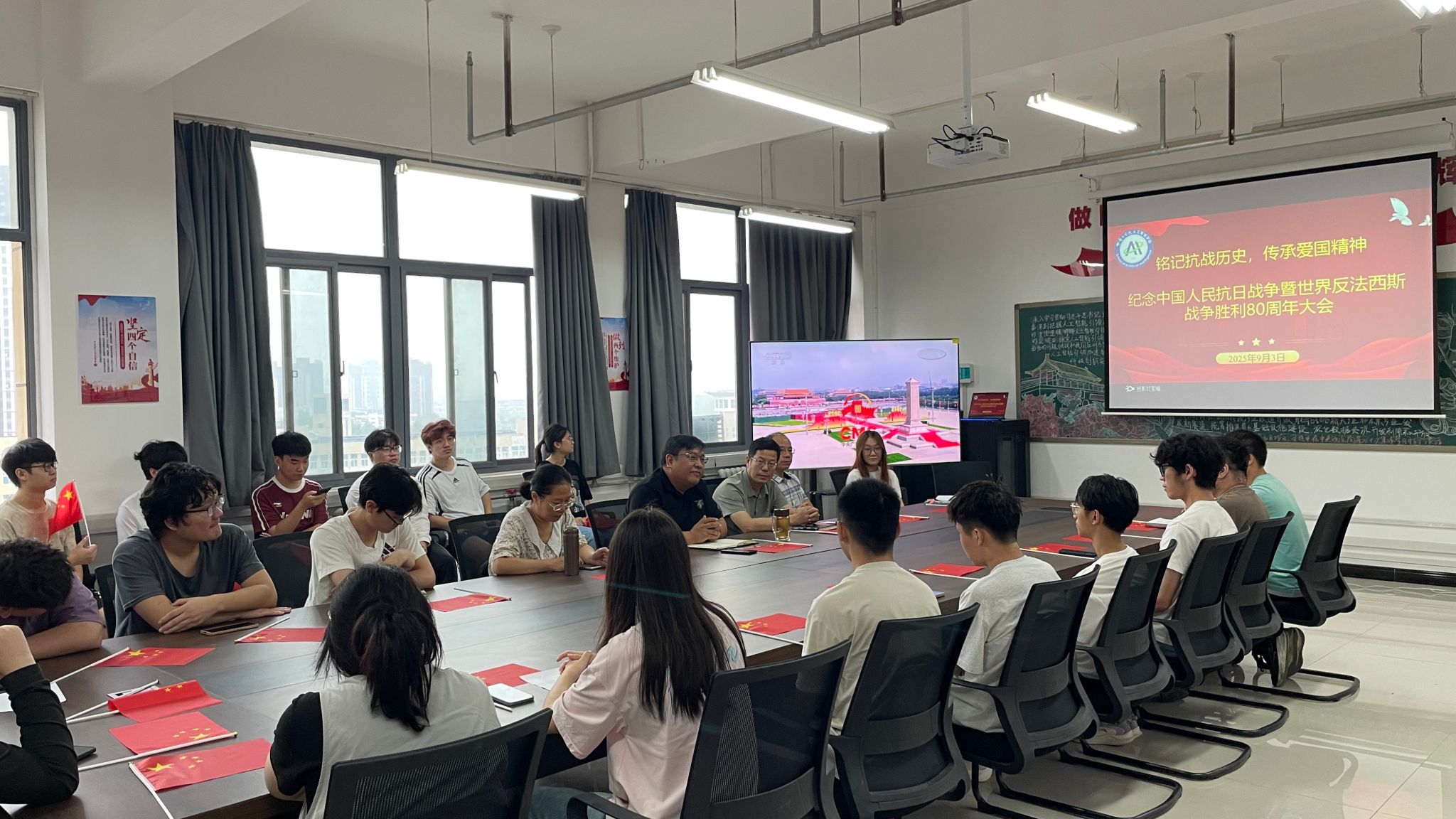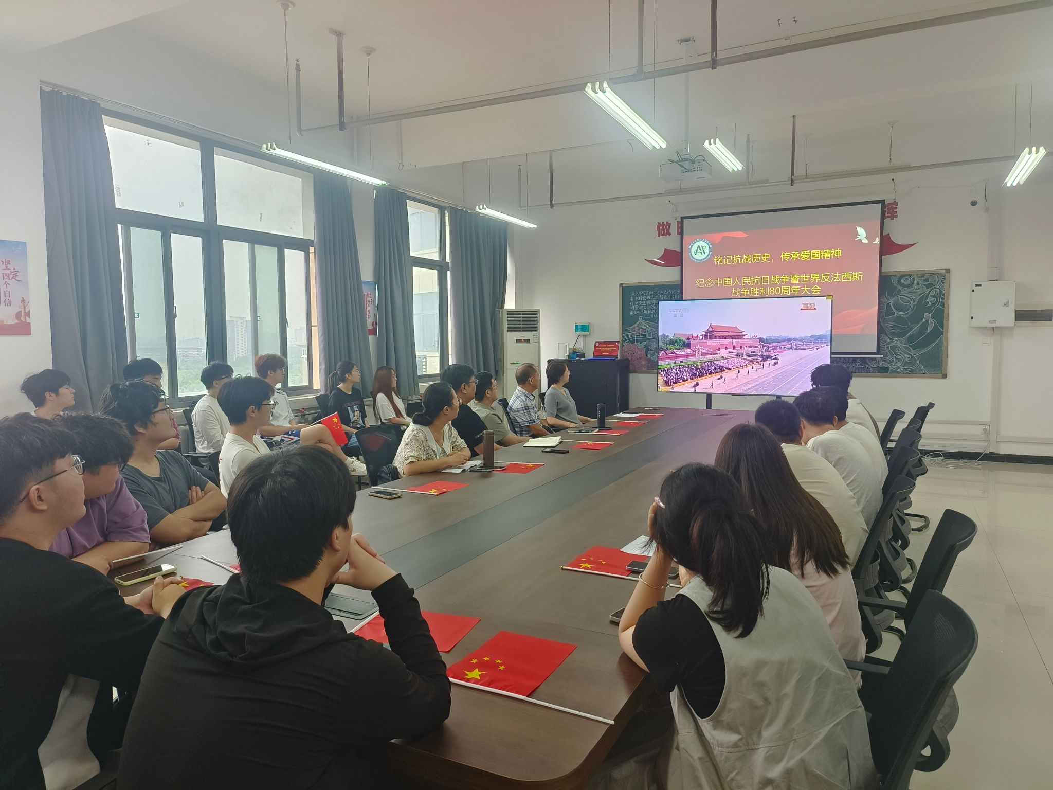 院长陈东义通过远程观看指导活动,他指出,这场阅兵既是历史回响,更是科技强国的时代注脚;每一行代码都是数字时代的"钢枪",每一次技术突破都是和平年代最坚实的守护;这种跨越时空的精神共鸣,正是新时代科技工作者最珍贵的传承。张志鹏号召大家:铭记历史,从抗战精神中汲取科技报国的精神力量;砺剑铸魂,以人工智能赋能国家战略需求;担当使命,在智能时代书写青春答卷。